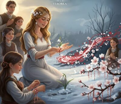 Pranvera buzëqeshi dhe u gjunjëzua pranë një lulebore që kishte guxuar të çelte përmes akullit. Ajo e mbrojti me duart e saj të ngrohta, por një erë e ashpër i lëndoi gishtat. Një pikë gjaku ra mbi dëborën e bardhë.